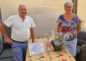 C’est avec plaisir qu’ils ont reçu une coupe de fleurs, une bouteille de vin pétillant rosé dans un sac réfrigéré et le diplôme de noces d’or pour l’occasion des mains du président de l’ UD accompagné de son épouse.
