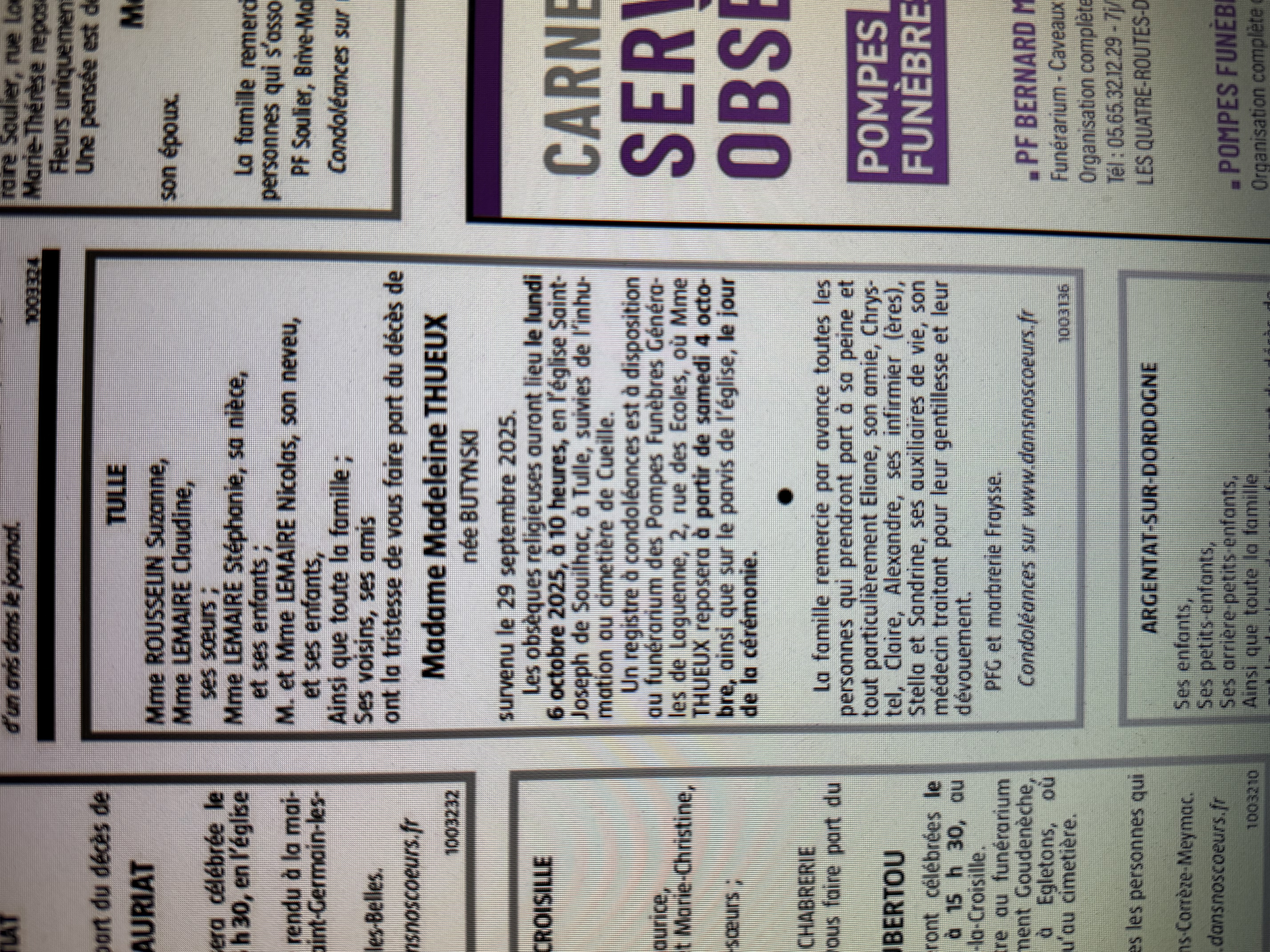 Elle repose au funérarium de Laguenne sur Avalouze. Les obsèques seront célébrées le lundi 6 octobre 2025 à 10 heures en l’église saint Joseph de Souillac