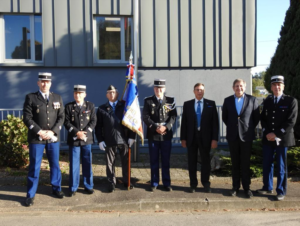 De gauche à droite : Chef d escadron Yann Favennec, Cdt la Cie – le Colonel Frédéric Mahe, commandant en second l’école de gendarmerie de Châteaulin – Jean-François Lefevre, porte drapeau Unprg – Jean-François Marez, président de la section Unprg – le sénateur Philippe Paul et le Colonel (R) Le Bihan.