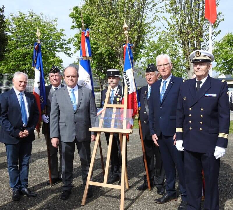 Le drap tricolore, recouvrant la plaque commémorative, a été officiellement retiré simultanément par le général Hubert Bonneau et le capitaine de corvette en retraite Marcel Salou, en uniforme, entouré de sa famille. Il est le père de Xavier.
