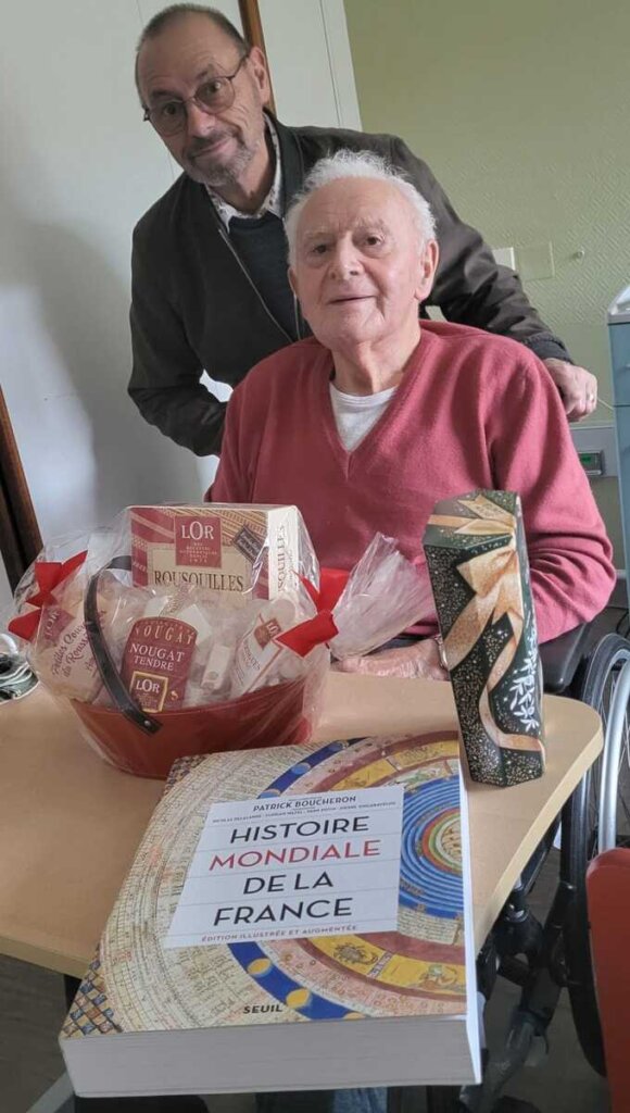 Un cadeau composé d’une boîte de chocolats, d’un panier gourmand Catalan et d’un livre sur l’histoire mondiale de la France lui a été remis au titre de la solidarité de notre association.